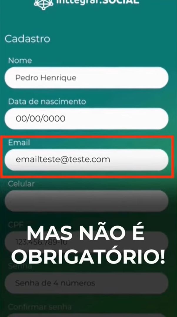 - No Cadastro, temos que preencher os campos: Nome; Data de Nascimento; E-mail (não é obrigatório); Celular; CPF; Senha ( não pode ser sequencial);