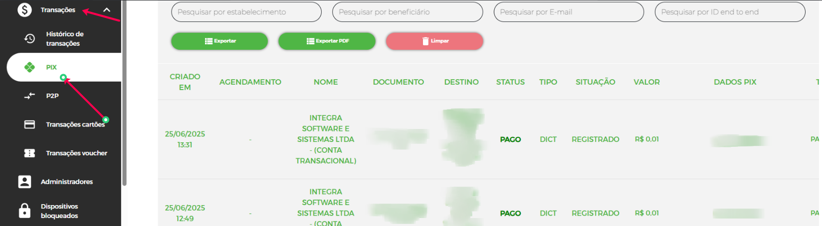 No menu lateral ou superior, clique na opção "Transações PIX".