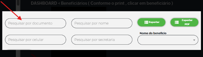 Utilize o campo "PESQUISAR POR DOCUMENTO" e insira o CPF do beneficiário.