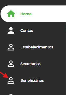Acesse a opção "Beneficiários" no menu lateral da Dashboard (conforme indicado no print).